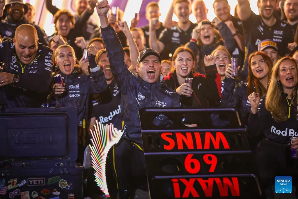 Imagen del 22 de noviembre de 2025 del piloto neerlandés de la escudería Red Bull, Max Verstappen (c), festejando con los miembros de su escudería al término del Gran Premio de Las Vegas 2025 de Fórmula Uno, en el Circuito de Las Vegas, en Las Vegas, Estados Unidos. (Xinhua/Song Haiyuan)