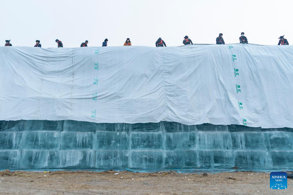Empleados retiran la cubierta de los cubos de hielo en un sitio de almacenamiento de hielo para el Mundo de Hielo y Nieve de Harbin, en Harbin, en la provincia de Heilongjiang, en el noreste de China, el 24 de noviembre de 2025. La 27 edición del Mundo de Hielo y Nieve de Harbin, un famoso parque temático de temporada en Harbin, comenzará oficialmente a construirse el 25 de noviembre de este año. (Xinhua/Xie Jianfei)