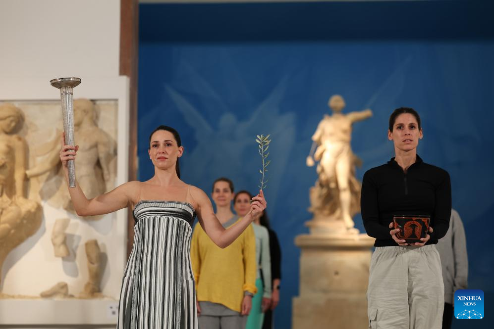 La actriz Mary Mina (izq.), en el papel de una Suma Sacerdotisa de la antigua Grecia, actúa durante el ensayo de la ceremonia de encendido de la llama olímpica para los Juegos Olímpicos de Invierno Milán-Cortina 2026, en Olimpia, Grecia, el 25 de noviembre de 2025. (Xinhua/Li Jing).