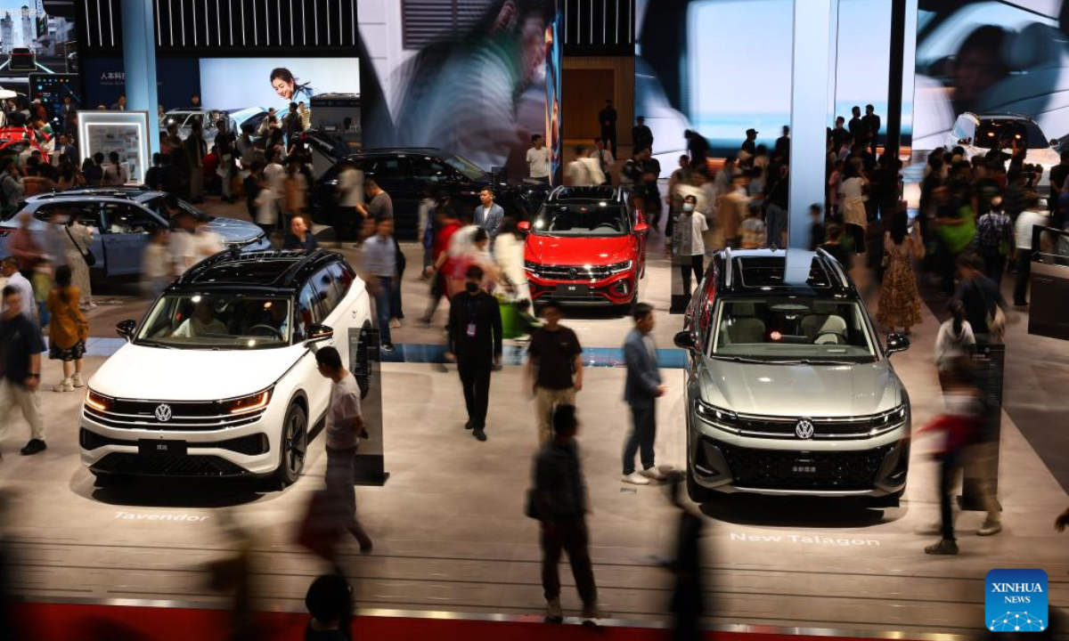 Automóviles Volkswagen en la 21.ª Exposición Internacional de la Industria Automotriz de Shanghai, en Shanghai, este de China, 1 de mayo de 2025. Visitantes en la muestra el primer día del feriado por el 1 de Mayo. (Xinhua)