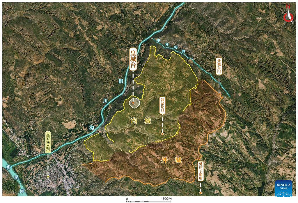 Imagen de un diagrama estructural de las murallas de la ciudad en las ruinas de Shimao, en Yulin, en la provincia de Shaanxi, en el noroeste de China. Científicos han utilizado ADN antiguo para reconstruir la intrincada estructura social de una de las primeras ciudades de China, revelando una sociedad genéticamente diversa anclada en la autoridad de clanes patrilineales. (Xinhua/Administración Nacional del Patrimonio Cultural)