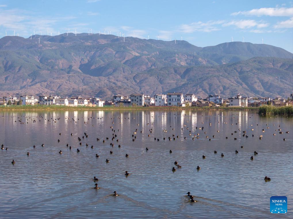 Una foto tomada con dron muestra una bandada de aves buscando alimento en un humedal en el distrito de Eryuan, prefectura autónoma de la etnia bai de Dali, suroeste de China, el 30 de noviembre de 2025. (Foto de Luo Xincai/Xinhua).
