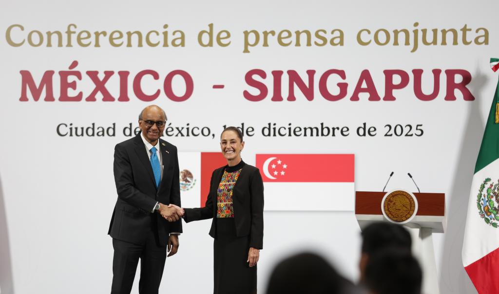 La presidenta mexicana, Claudia Sheinbaum (d), estrecha la mano del presidente de Singapur, Tharman Shanmugaratnam (i), durante una conferencia de prensa conjunta, en Palacio Nacional, en la Ciudad de México, capital de México, el 1 de diciembre de 2025. (Xinhua/Francisco Cañedo)