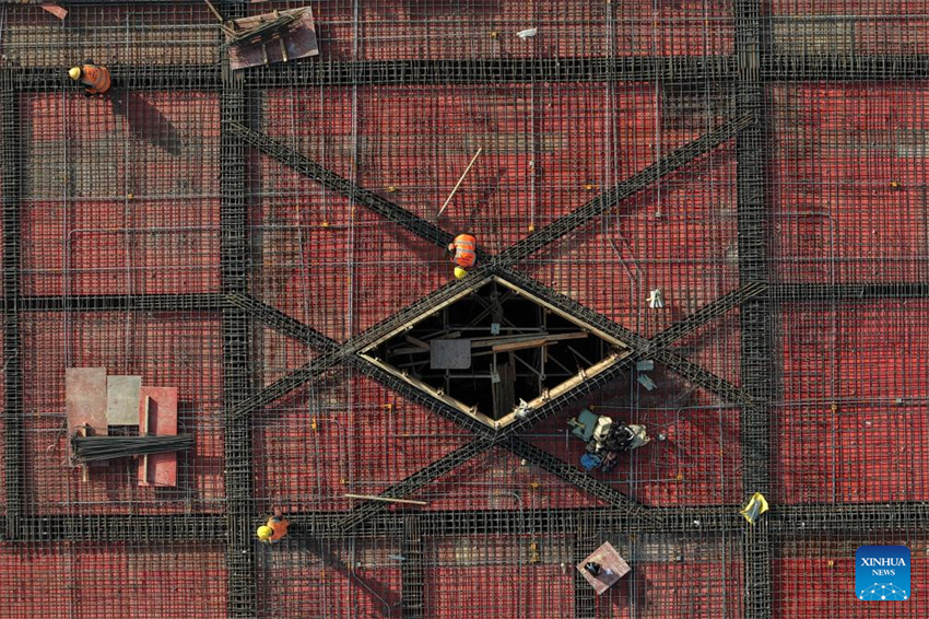 Una foto aérea tomada con dron el 30 de noviembre de 2025 muestra a operarios trabajando en la obra de construcción de una plaza frente a la estación de tren Huaibei Oeste, provincia de Anhui, este de China. (Xinhua/Huang Bohan).