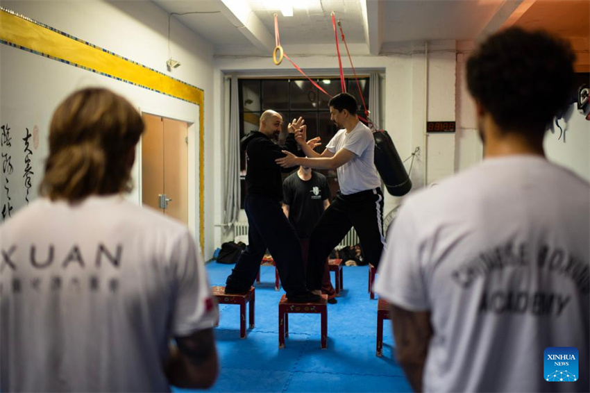Ismet Himmet (atrás a la izquierda) instruye a los alumnos que practican “tuishou” en la Academia XUAN-Gong Fu de Berlín, Alemania, el 13 de noviembre de 2025. (Xinhua/Zhang Haofu).