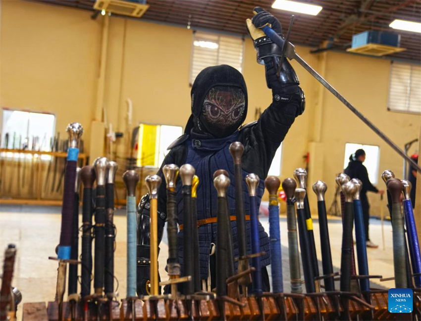 She Yuran se prepara para practicar con espadas largas con un amigo en el club Shanghai Historical Martial Arts (SHMA) en Shanghai, en el este de China, el 22 de noviembre de 2025. (Xinhua/Liu Ying).