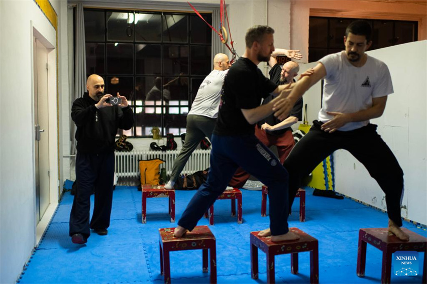 Ismet Himmet (1.º por la izquierda) graba a los alumnos mientras practican en la academia XUAN-Gong Fu de Berlín, Alemania, el 13 de noviembre de 2025. (Xinhua/Zhang Haofu).