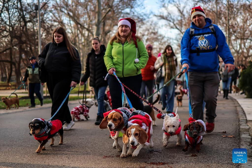 Imagen del 6 de diciembre de 2025 de participantes caminando con sus perros durante el evento anual "Caminata de Perros Santa" en el Parque de la Ciudad, en Budapest, Hungría. El evento con temática navideña reúne a propietarios de perros de toda la ciudad para dar un paseo estacional, promoviendo la tenencia responsable de mascotas y fomentando las actividades al aire libre para las familias y sus mascotas. (Xinhua/David Balogh)