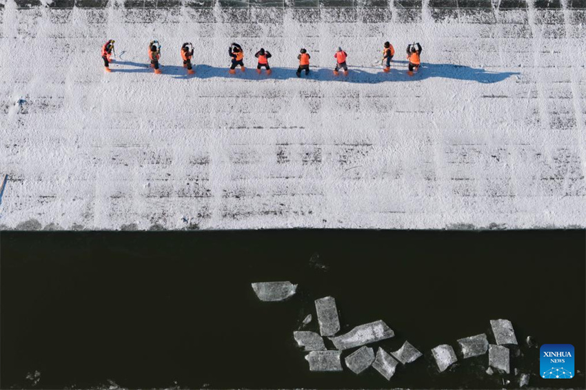 Una foto aérea tomada con un dron muestra a unos trabajadores recogiendo hielo en el tramo del río Songhua que atraviesa Harbin, en la provincia de Heilongjiang, noreste de China, el 9 de diciembre de 2025. (Xinhua/Zhang Tao).