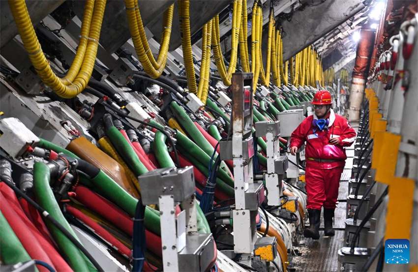 Un trabajador inspecciona el frente de extracción de carbón de Shaanxi Coal Caojiatan Mining Co., Ltd. en Yulin, provincia de Shaanxi, noroeste de China, el 29 de febrero de 2024. (Xinhua/Zou Jingyi).