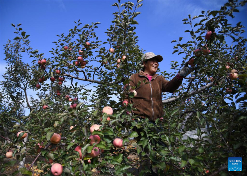 Una agricultora cosecha manzanas en un huerto de la localidad de Zhaoshipan, en el distrito de Hengshan, en Yulin, provincia de Shaanxi, al noroeste de China, el 4 de noviembre de 2025.