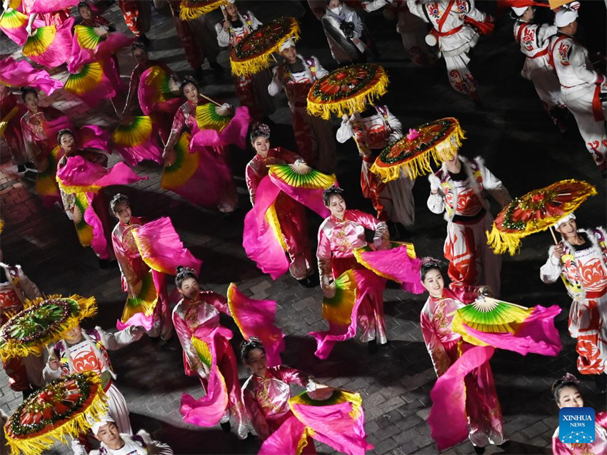 La danza Yangko se representa en una feria de patrimonio cultural inmaterial en Yulin, provincia de Shaanxi, noroeste de China, el 17 de febrero de 2023. (Xinhua/Zou Jingyi).