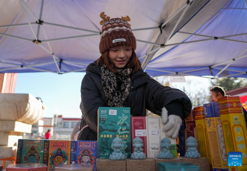 Una comerciante coloca productos durante una feria de suministro y comercialización en un parque de Lhasa, en la región autónoma de Xizang, suroeste de China, el 10 de diciembre de 2025. (Xinhua/Jigme Dorje).