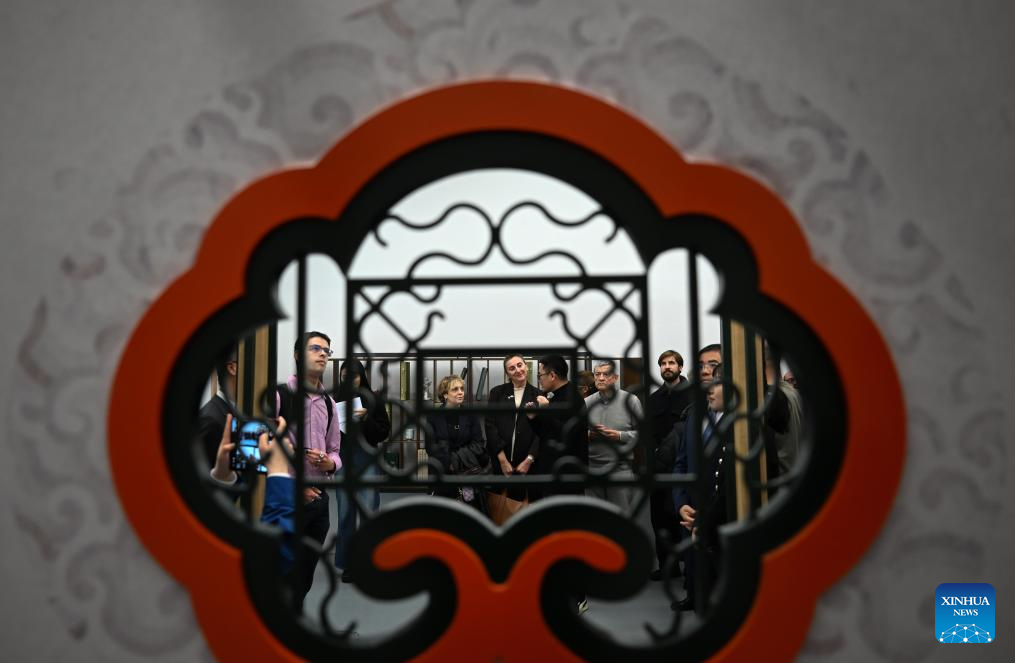 Visitantes escuchan una presentación sobre las obras expuestas durante una muestra titulada "Anshan Cuijin - Una exposición sobre la estética de la vida china" en el Centro Cultural de China en Madrid, España, el 16 de diciembre de 2025. (Xinhua/Cheng Min).