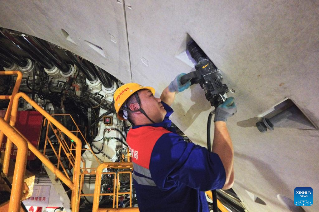 Un trabajador aprieta un perno en el sitio de construcción del túnel Chongming-Taicang, parte del ferrocarril de alta velocidad Shanghai-Chongqing-Chengdu, bajo el río Yangtze, el 16 de diciembre de 2025. La excavación en curso del túnel bajo el río Yangtze, llevada a cabo por la mayor máquina tuneladora con escudo de gran diámetro del mundo para ferrocarriles de alta velocidad, la "Linghang", desarrollada de manera independiente por China, superó el martes la marca de los 10.000 metros, lo que sentó una base sólida para la finalización del túnel. (Xinhua/Fang Zhe)