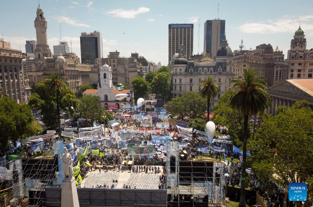 Imagen tomada con un dron de personas participando en una manifestación contra la reforma laboral impulsada por el Gobierno argentino en la Plaza de Mayo, en la ciudad de Buenos Aires, capital de Argentina, el 18 de diciembre de 2025. La Confederación General del Trabajo y otras centrales sindicales de Argentina se movilizaron el jueves a la emblemática Plaza de Mayo, en el centro de la ciudad de Buenos Aires, para expresar su rechazo a un proyecto de reforma laboral que impulsa el gobierno del presidente Javier Milei. (Xinhua/Martín Zabala)