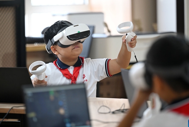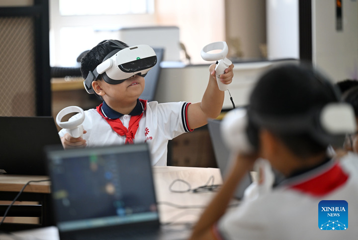 Imagen del 4 de septiembre de 2025 de estudiantes experimentando con equipos de realidad virtual en un centro de experiencia de inteligencia artificial (IA) de una escuela primaria, en Tianjin, en el norte de China. (Xinhua/Zhao Zishuo)
