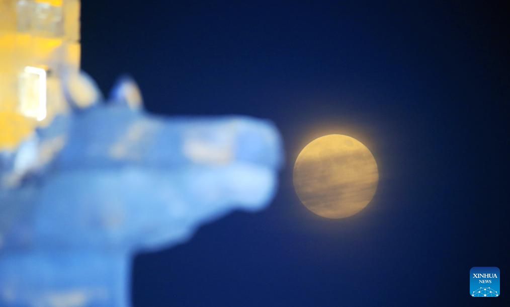 Imagen del 3 de enero de 2026 de la luna sobre el Mundo de Hielo y Nieve, en la ciudad de Harbin, en la provincia de Heilongjiang, en el noreste de China. La primera superluna de 2026, caracterizada por la inusual proximidad cercana de la Luna a la Tierra, resultando en una apariencia más grande y brillante, se mostró en el cielo el sábado. (Xinhua/Zhang Shu)