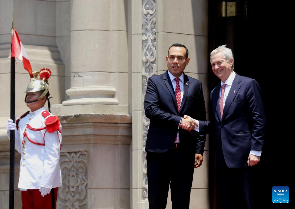 El presidente peruano, José Jerí (c), estrecha la manco del presidente electo de Chile, José Antonio Kast (d), a su llegada al Palacio de Gobierno, en Lima, Perú, el 7 de enero de 2026. Jerí recibió el miércoles al mandatario electo de Chile, José Antonio Kast, en el Palacio de Gobierno en Lima, en el inicio de una jornada de trabajo bilateral en la que discutieron un amplio abanico de temas, informó la sala de prensa de la Presidencia de la República del Perú. (Xinhua/Mariana Bazo)