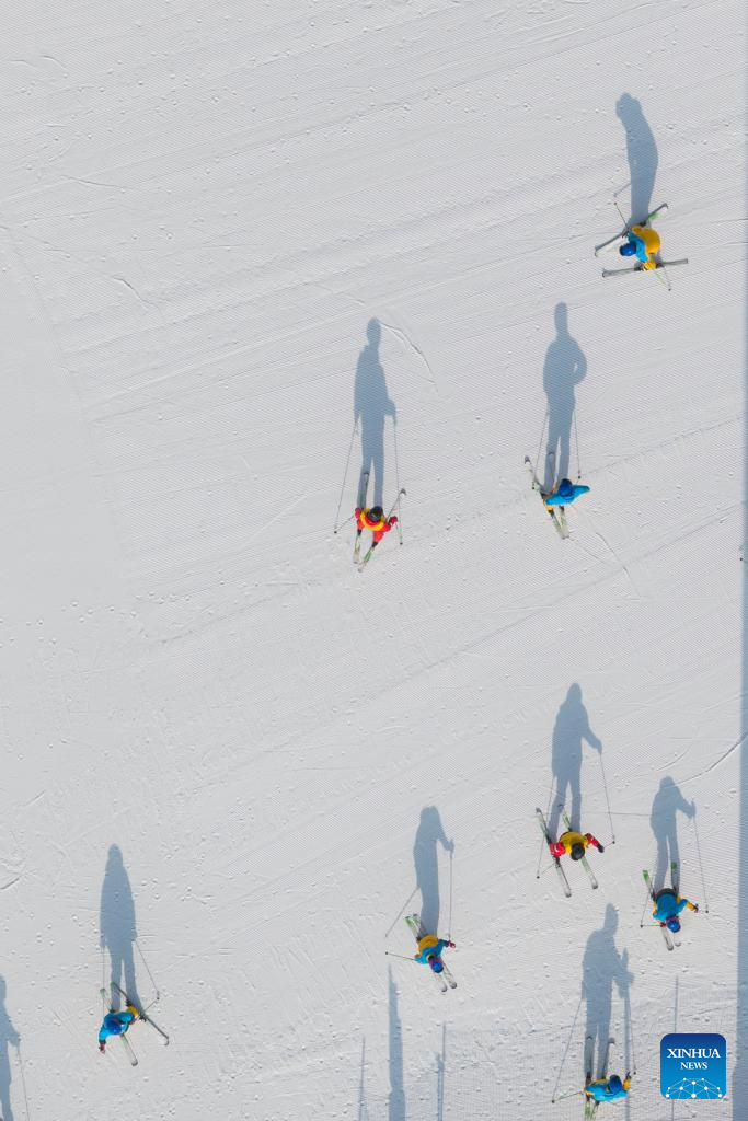 Vista aérea tomada con un dron el 7 de enero de 2026 de turistas esquiando en la estación internacional de esquí de Guangwu, en el distrito de Shanyin de Shuozhou, en la provincia de Shanxi, en el norte de China. El distrito de Shanyin ha estado aprovechando su ventaja geográfica para desarrollar el turismo temático de hielo y nieve, que ahora es un nuevo motor para la economía local. (Xinhua/Yang Chenguang)