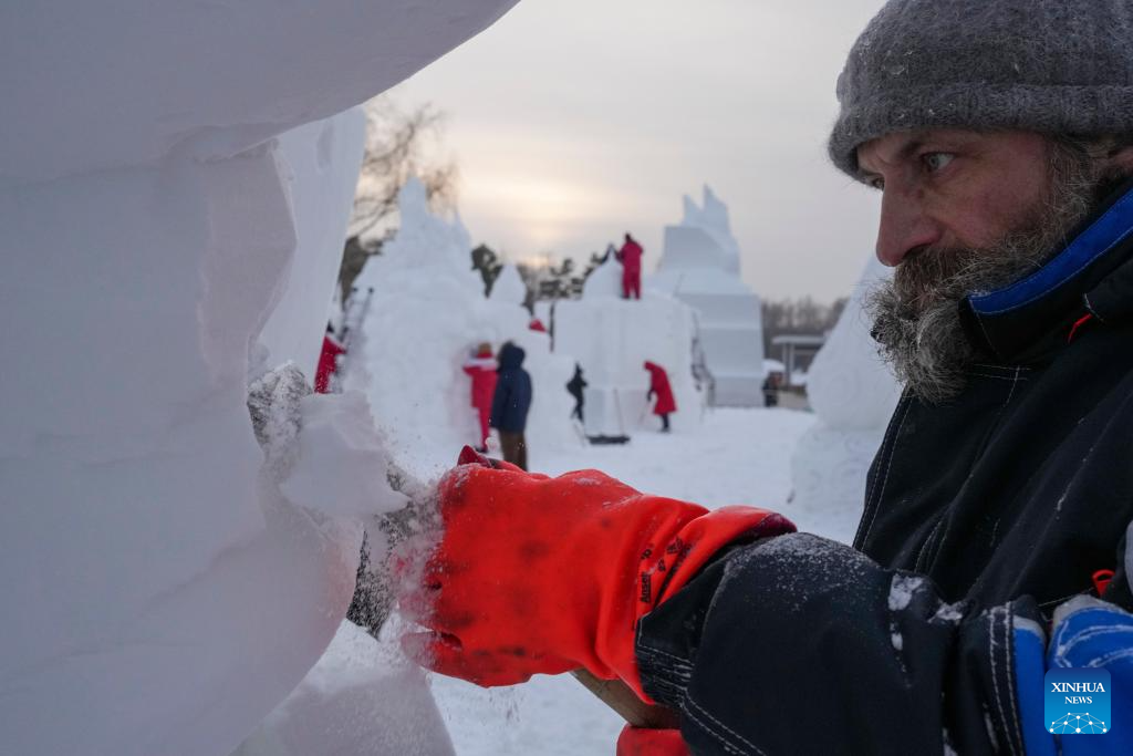 Concursantes trabajan en una escultura de nieve en la Exposición Internacional de Arte de Esculturas de Nieve de la Isla del Sol, en Harbin, en la provincia de Heilongjiang, en el noreste de China, el 8 de enero de 2026. El 28 concurso internacional de esculturas de nieve de Harbin comenzó aquí el martes, atrayendo 25 equipos de escultores de nieve de 13 países. (Xinhua/Wang Jianwei)