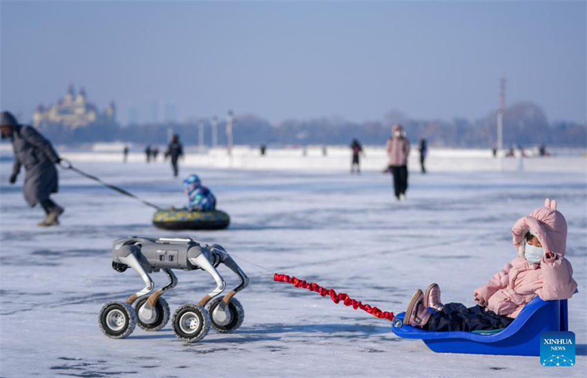 Un niño monta en un trineo tirado por un perro robótico sobre la superficie helada del río Songhua, en Harbin, provincia de Heilongjiang, noreste de China, el 11 de enero de 2026. (Xinhua/Wang Jianwei).