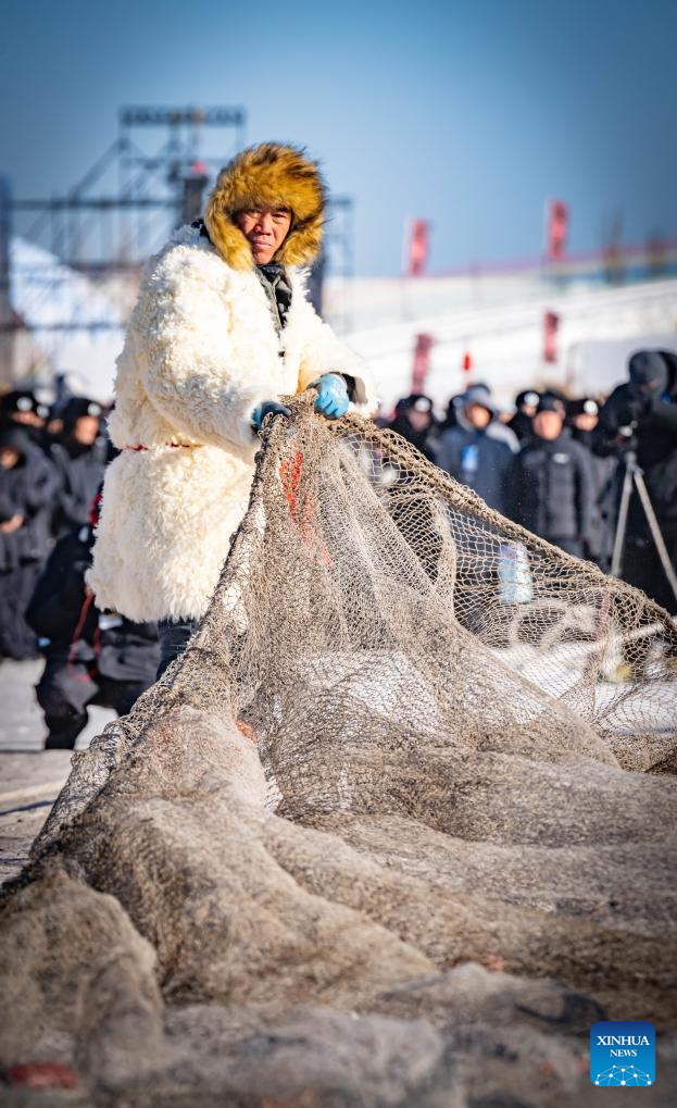 Esta foto tomada el 10 de enero de 2026 muestra a un pescador sacando una red de la superficie helada del lago durante el cuarto festival de pesca invernal de Hasuhai en Hohhot, en la región autónoma de Mongolia Interior, norte de China. (Foto de Xu Ting/Xinhua).