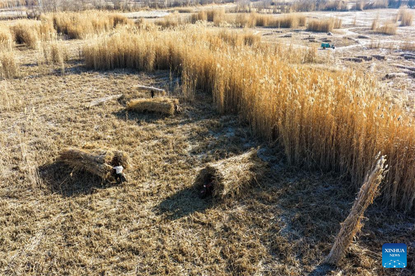 Una foto aérea tomada con un dron el 10 de enero de 2026 muestra a agricultores locales cosechando juncos en la localidad de Zawa, distrito de Moyu, prefectura de Hotan, región autónoma uigur de Xinjiang, en el noroeste de China. (Xinhua/Ding Lei).