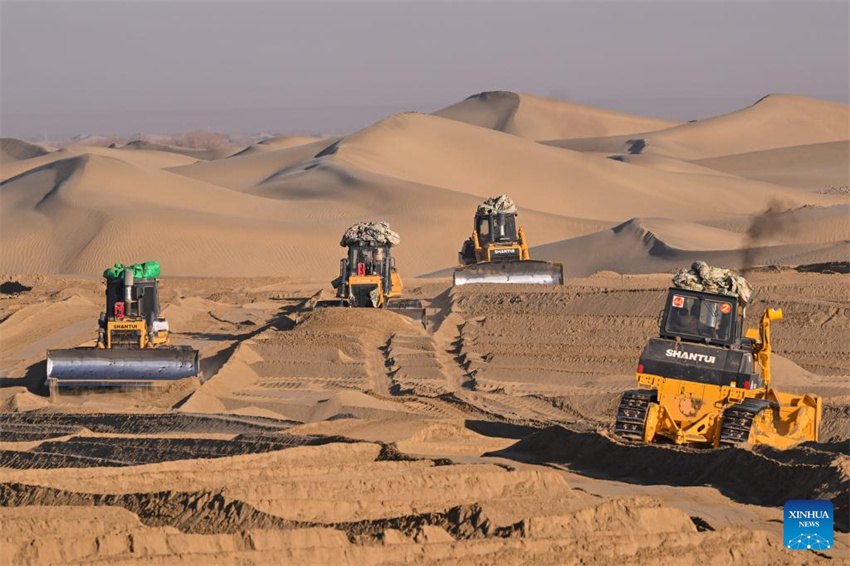 Grandes máquinas de ingeniería nivelan las dunas de arena en el municipio de Kawak, distrito de Moyu, prefectura de Hotan, región autónoma uigur de Xinjiang, en el noroeste de China, el 11 de enero de 2026. (Xinhua/Ding Lei).