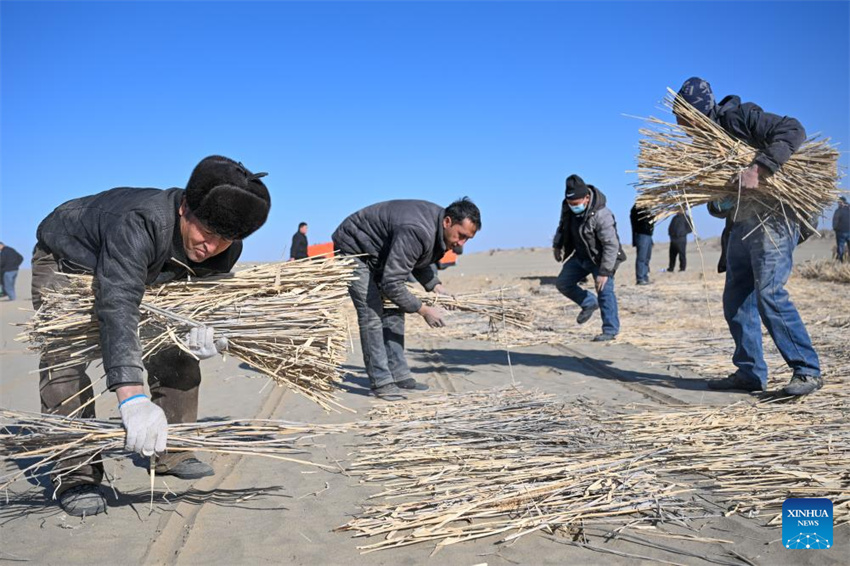 Los agricultores preparan cañas y colocan rejillas de arena para combatir la desertificación en Xinjiang, China