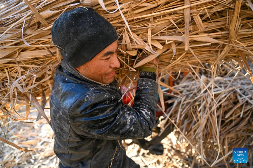 Un agricultor local transporta juncos recién cosechados en la localidad de Zawa, distrito de Moyu, prefectura de Hotan, región autónoma uigur de Xinjiang, en el noroeste de China, el 10 de enero de 2026. (Xinhua/Ding Lei).