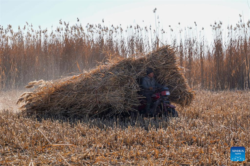 Un agricultor local entrega cañas recién cosechadas en la localidad de Zawa, distrito de Moyu, prefectura de Hotan, región autónoma uigur de Xinjiang, en el noroeste de China, el 10 de enero de 2026. (Xinhua/Ding Lei).