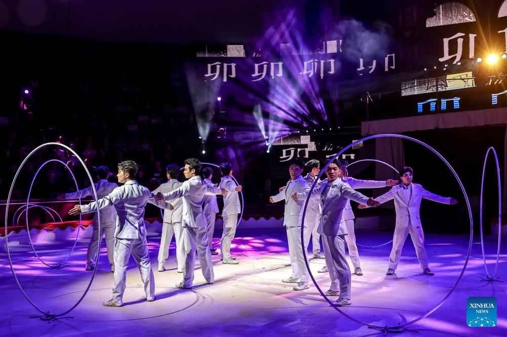 Miembros de la Compañía Nacional de Acrobacia de China realizan un número de salto con aros durante la gala del 16.º Festival Internacional de Circo de Budapest, en Budapest, Hungría, el 12 de enero de 2026. (Foto de David Balogh/Xinhua).
