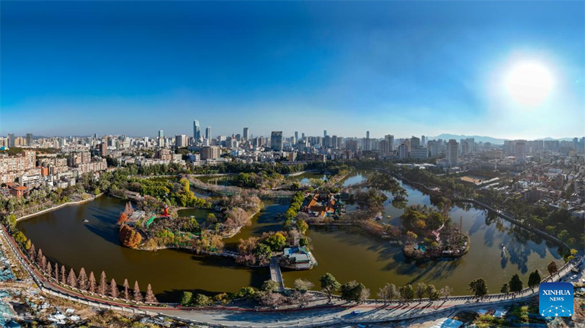 Una foto aérea tomada con un dron el 13 de enero de 2026 muestra una vista del lago Cuihu en Kunming, provincia de Yunnan, suroeste de China. (Xinhua/Peng Yikai).