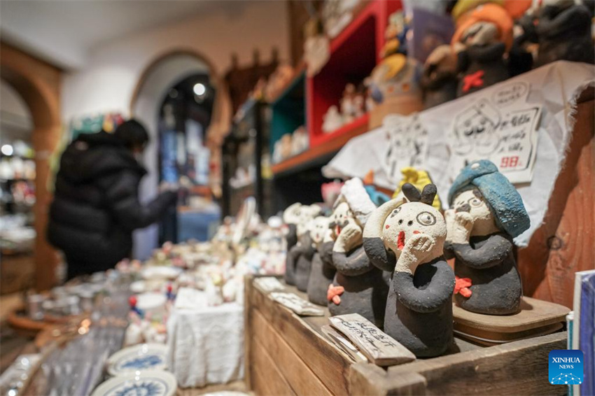 Una turista elige productos culturales y creativos en una librería junto al lago Cuihu, en Kunming, provincia de Yunnan, suroeste de China, el 13 de enero de 2026. (Xinhua/Peng Yikai).