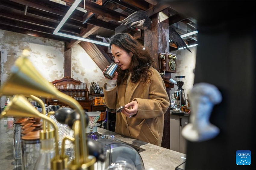Una empleada prepara café para los clientes en una cafetería centenaria cerca del lago Cuihu en Kunming, provincia de Yunnan, suroeste de China, 13 de enero de 2026. (Xinhua/Peng Yikai).