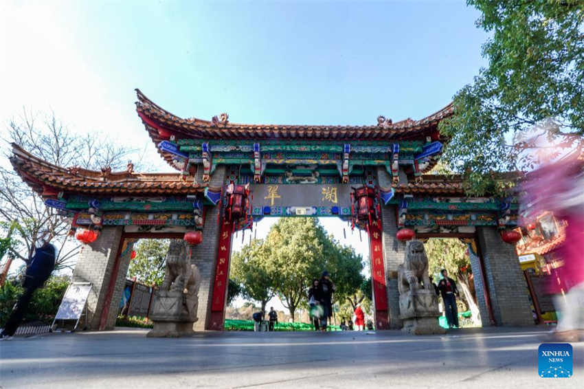 Turistas visitan el parque Cuihu en Kunming, provincia de Yunnan, suroeste de China, el 13 de enero de 2026. (Xinhua/Peng Yikai).