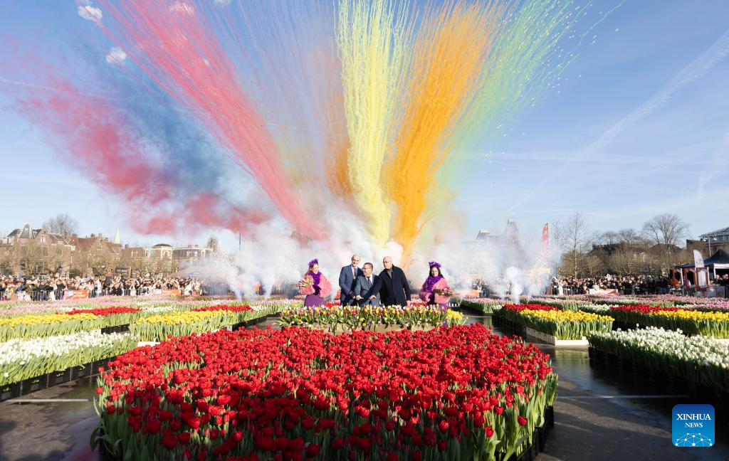 Imagen del 17 de enero de 2026 de un espectáculo de fuegos artificiales en un enorme jardín con más de 200.000 tulipanes en la Plaza de los Museos, en Amsterdam, Países Bajos. Los holandeses celebraron el Día Nacional del Tulipán, que tradicionalmente se celebra el tercer sábado del año. (Xinhua/Sylvia Lederer)