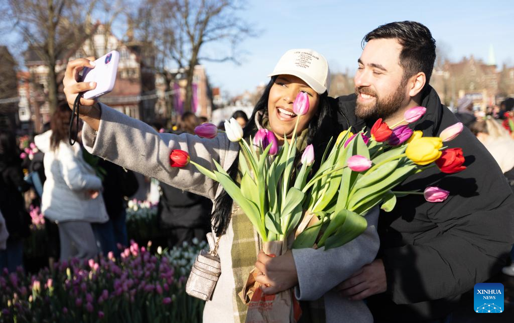 Imagen del 17 de enero de 2026 de personas tomándose fotografías en un enorme jardín con más de 200.000 tulipanes en la Plaza de los Museos, en Amsterdam, Países Bajos. Los holandeses celebraron el Día Nacional del Tulipán, que tradicionalmente se celebra el tercer sábado del año. (Xinhua/Sylvia Lederer)