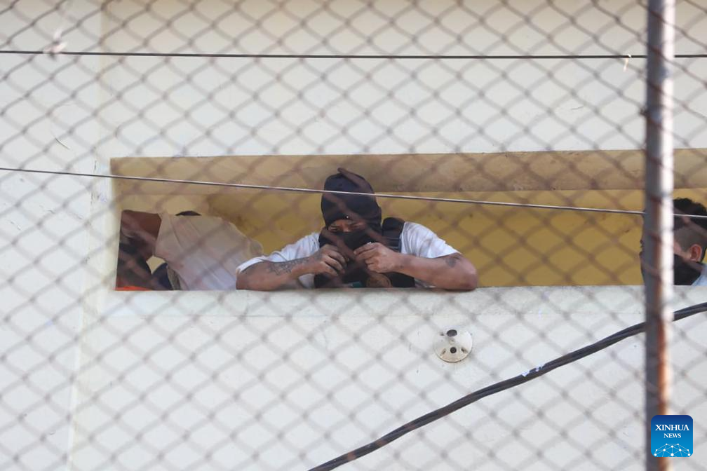 Imagen del 17 de enero de 2026 de una persona privada de la libertad vigilando durante un motín en el Centro de Detención para Hombres Fraijanes II, en el municipio de Fraijanes, Guatemala. En tres cárceles de Guatemala se registraron motines el sábado y al menos 46 personas fueron tomadas como rehenes, dijo el ministro de Gobernación, Marco Antonio Villeda. (Xinhua/Str)