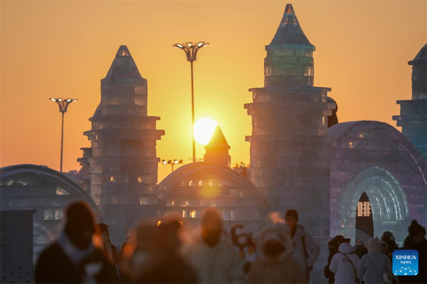Los turistas se divierten al atardecer en el Mundo de Hielo y Nieve de Harbin, el parque temático de hielo y nieve más grande del mundo, en Harbin, provincia de Heilongjiang, noreste de China, el 18 de enero de 2026. (Xinhua/Wang Jianwei).
