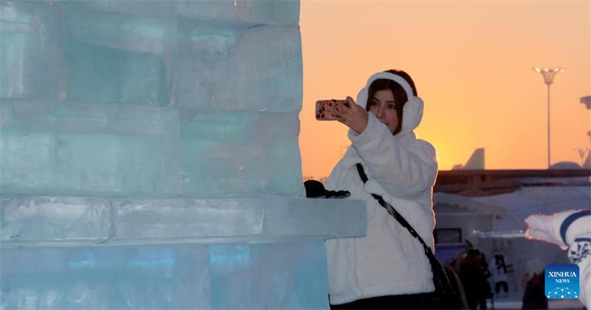 Los turistas se divierten al atardecer en el Mundo de Hielo y Nieve de Harbin, en el noreste de China