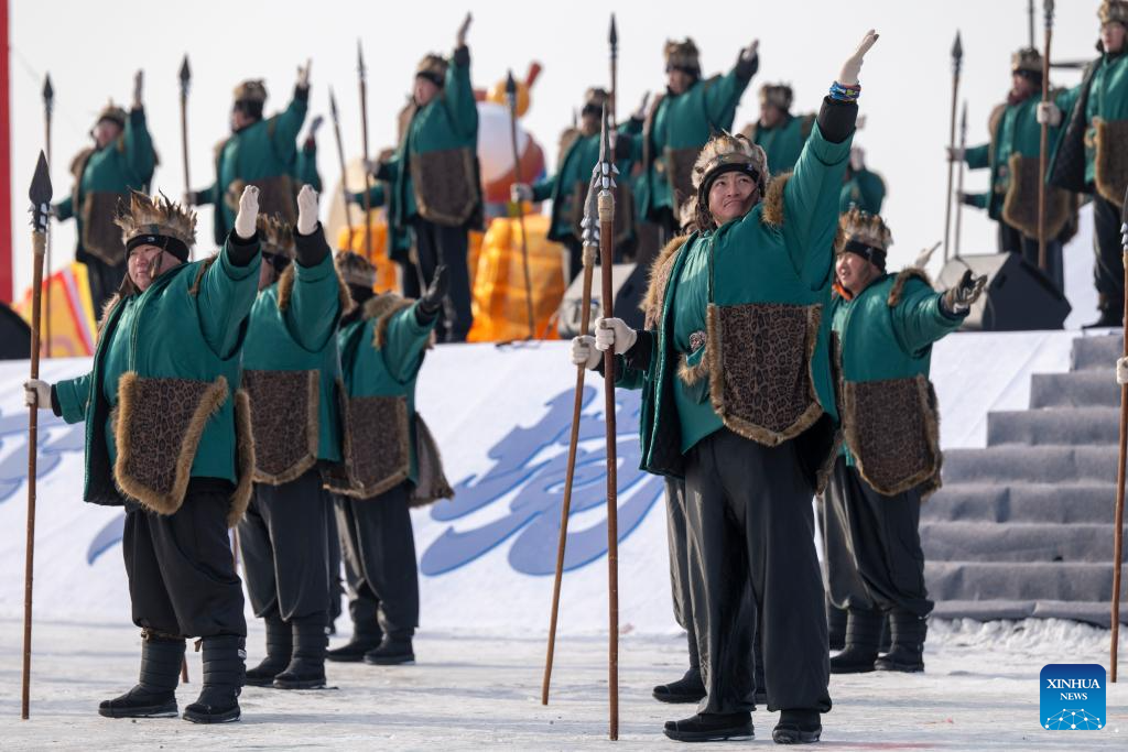 Actores actúan durante el festival de pesca invernal del lago Xingkai 2026, provincia de Heilongjiang, en el noreste de China, el 17 de enero de 2026. (Xinhua/Zhang Tao).