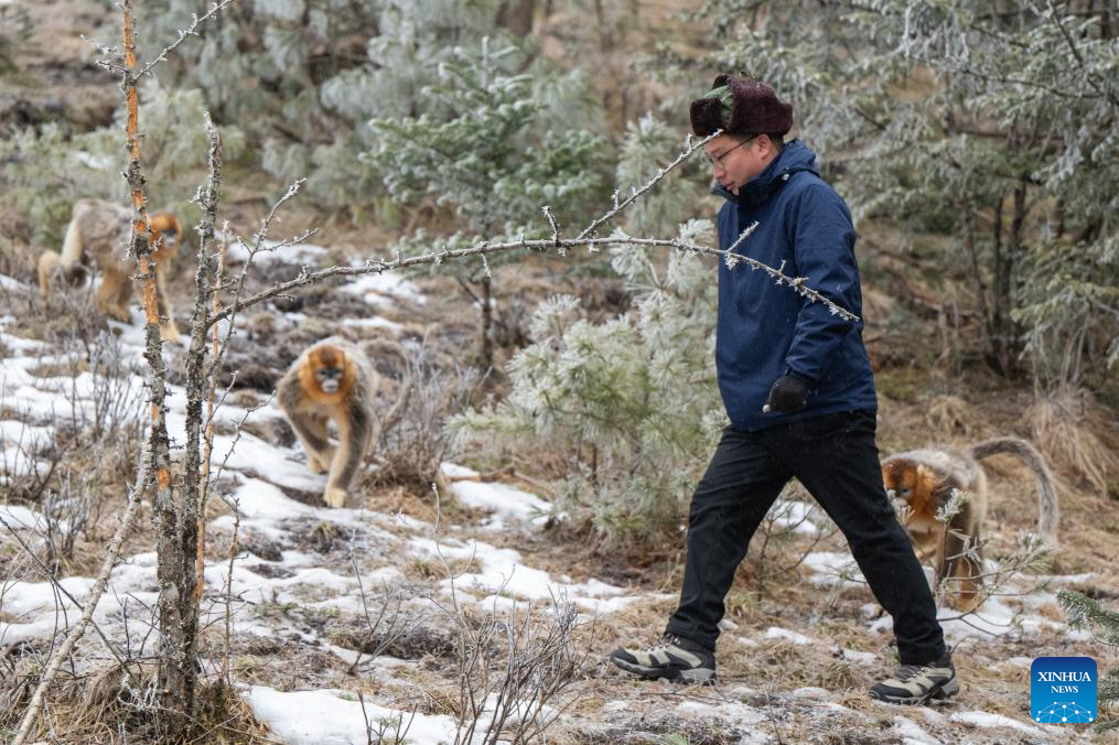 Un investigador comprueba el estado de los monos dorados de nariz chata en el Centro de Investigación de Monos Dorados de Dalongtan, en el Parque Nacional de Shennongjia, dependiente del Distrito Forestal de Shennongjia, provincia de Hubei, en el centro de China, el 19 de enero de 2026. (Xinhua/Du Zixuan).