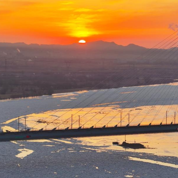 Vista aérea tomada con un dron el 21 de enero de 2026 de la superficie congelada del río Amarillo a lo largo de la frontera entre la ciudad de Shizuishan de la región autónoma hui de Ningxia, en el noroeste de China, y la ciudad de Wuhai de la región autónoma de Mongolia Interior, en el norte de China, en medio de una ola de frío. (Xinhua/Yuan Hongyan)