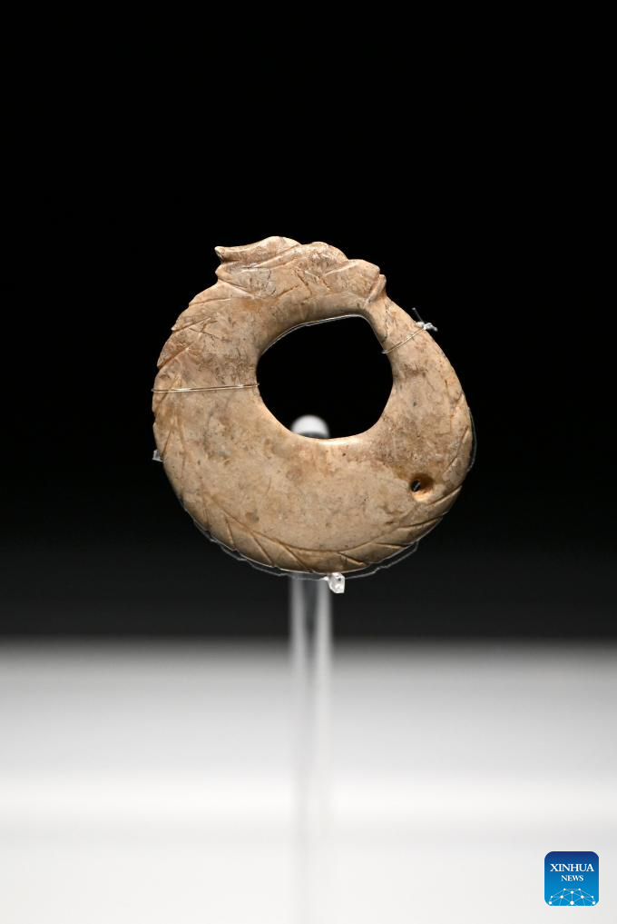 Esta foto tomada el 16 de mayo de 2025 muestra un dragón de jade expuesto en el Museo del Yacimiento Lingjiatan, en el distrito de Hanshan, Ma'anshan, provincia de Anhui, en el este de China. (Xinhua/Huang Bohan).