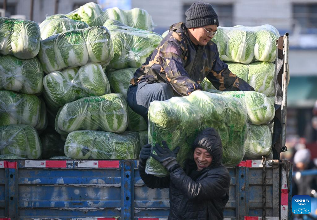 Empleados trasladan bolsas de verduras en un mercado del distrito de Saybag, en Urumqi, capital de la región autónoma uigur de Xinjiang, en el noroeste de China, el 21 de enero de 2026. Una ola de frío ha azotado la región en los últimos días, con temperaturas que han bajado hasta los 47 grados centígrados bajo cero en algunas partes de la prefectura de Altay. En medio de fuertes vientos y nevadas, las autoridades locales encargadas de los sectores del transporte y la energía han coordinado sus esfuerzos para garantizar el servicio ininterrumpido de calefacción y el suministro diario a los residentes. (Xinhua/Wang Fei).