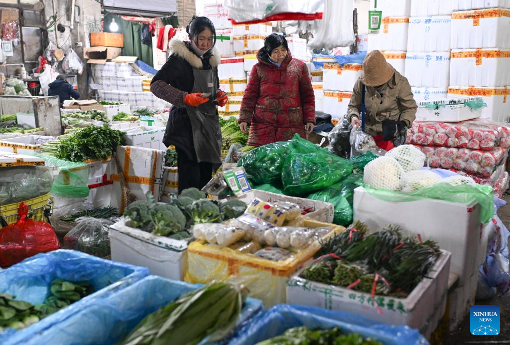 Unas residentes compran verduras en un mercado del distrito de Saybag, en Urumqi, región autónoma uigur de Xinjiang, en el noroeste de China, el 21 de enero de 2026. (Xinhua/Wang Fei).