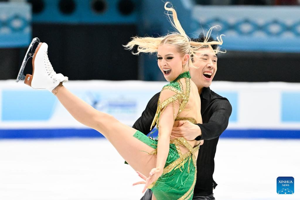 Holly Harris (delante) y Jason Chan, de Australia, actúan durante la danza rítmica sobre hielo en el Campeonato de Patinaje Artístico de los Cuatro Continentes de la ISU, celebrado en Beijing, China, el 22 de enero de 2026. (Xinhua/Ju Huanzong).