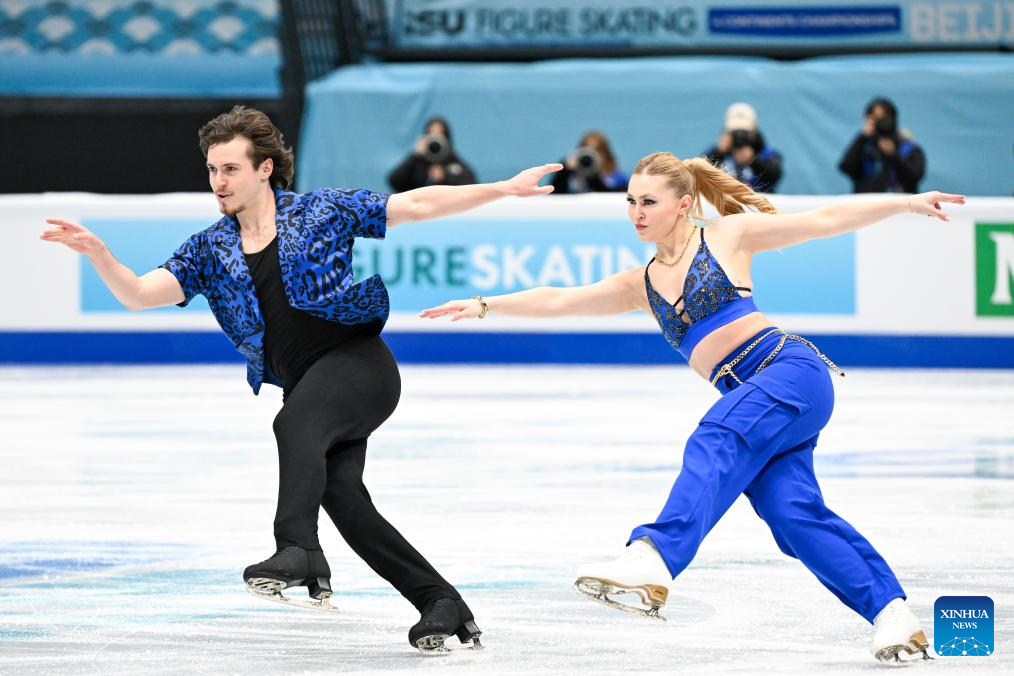 Alicia Fabbri (derecha) y Paul Aye, de Canadá, actúan durante la danza rítmica sobre hielo en el Campeonato de Patinaje Artístico de los Cuatro Continentes de la ISU en Beijing, China, el 22 de enero de 2026. (Xinhua/Ju Huanzong).